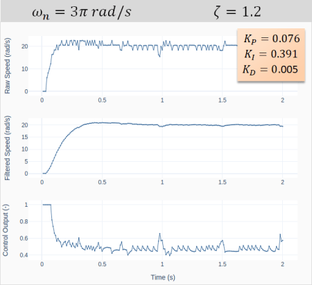 Observe the 1/4 decay ratio of the amplitude. Also, the fact that the motor position cannot meet exactly 60 degrees causes the integral error to build up, resulting in small position “jumps” around the 1.4 and 1.7 s marks.