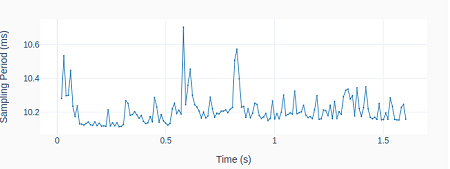 ax.plot(t[1::], 1000*np.diff(t), linewidth=1.5, color='#1f77b4')